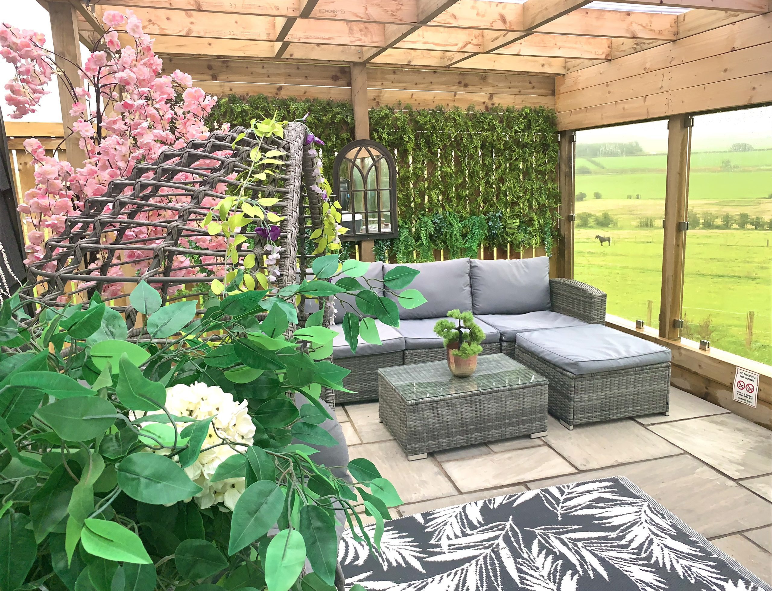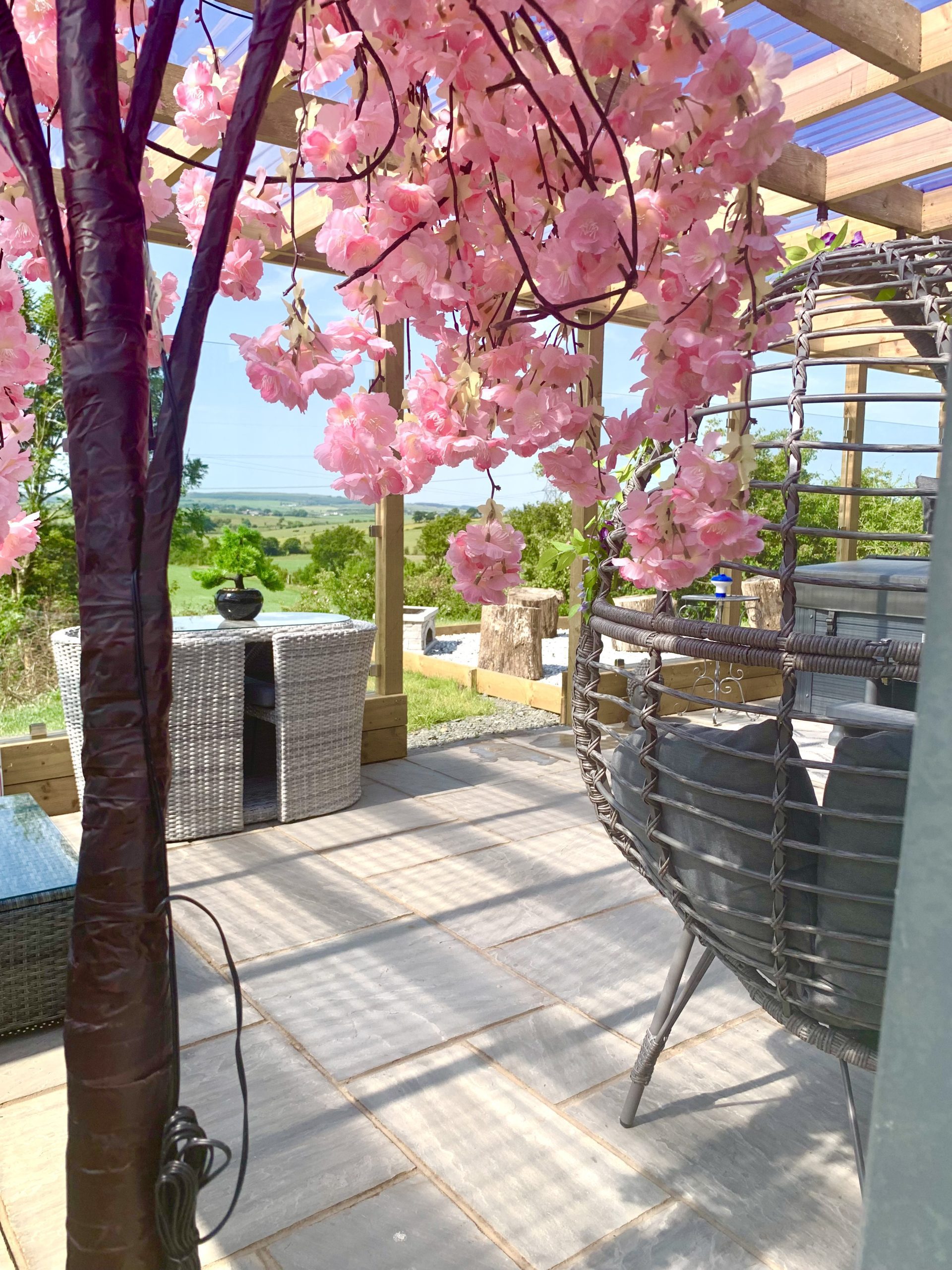 Outside Killoch has a large covered paved terrace with an outside/inside feel. On the terrace is an amazing hot tub, outdoor sofa and egg chair for your comfort and decorative plants and stunning lighting. Also a large masonry BBQ and pizza oven to be used with BBQ ... 😀