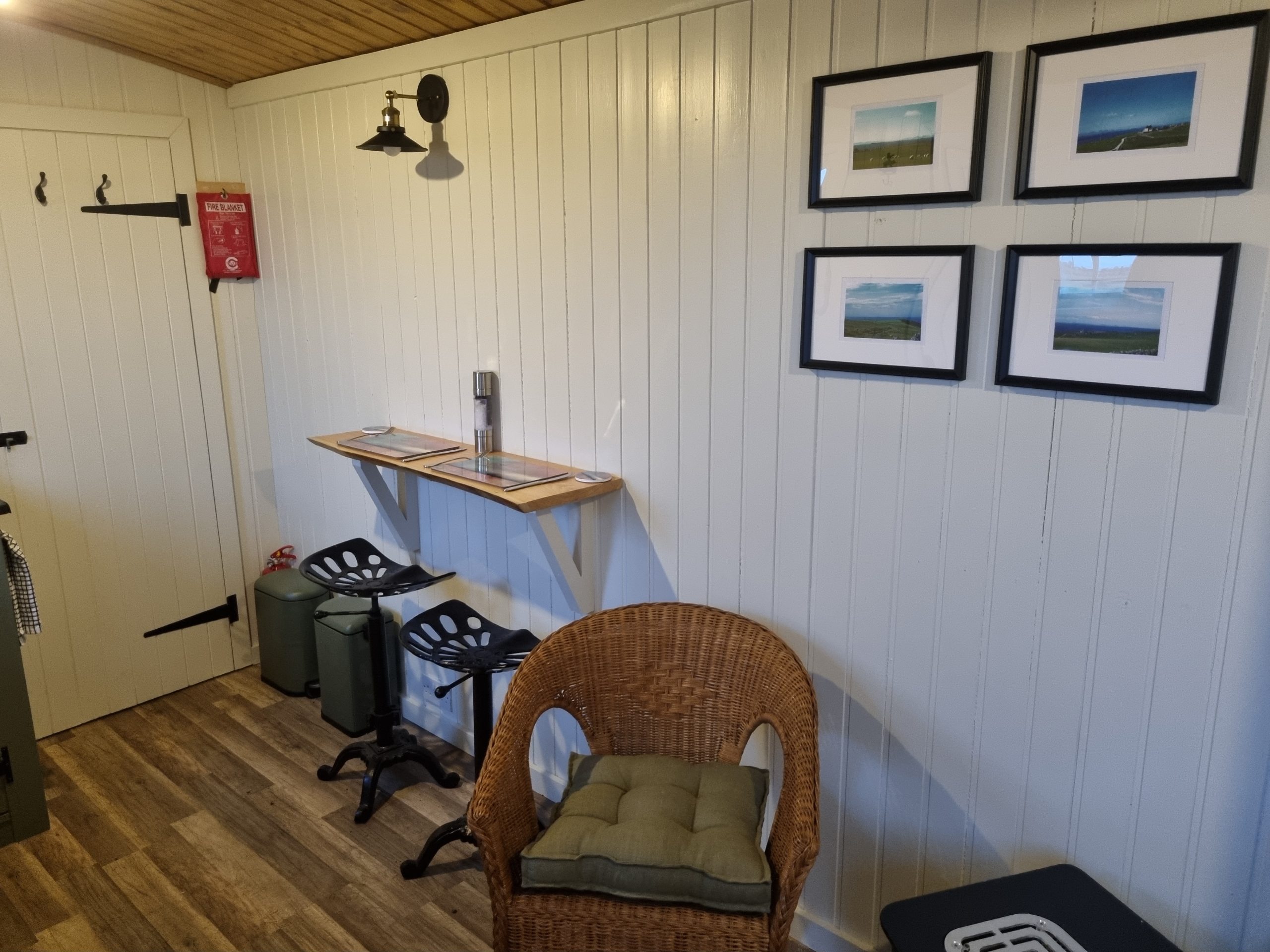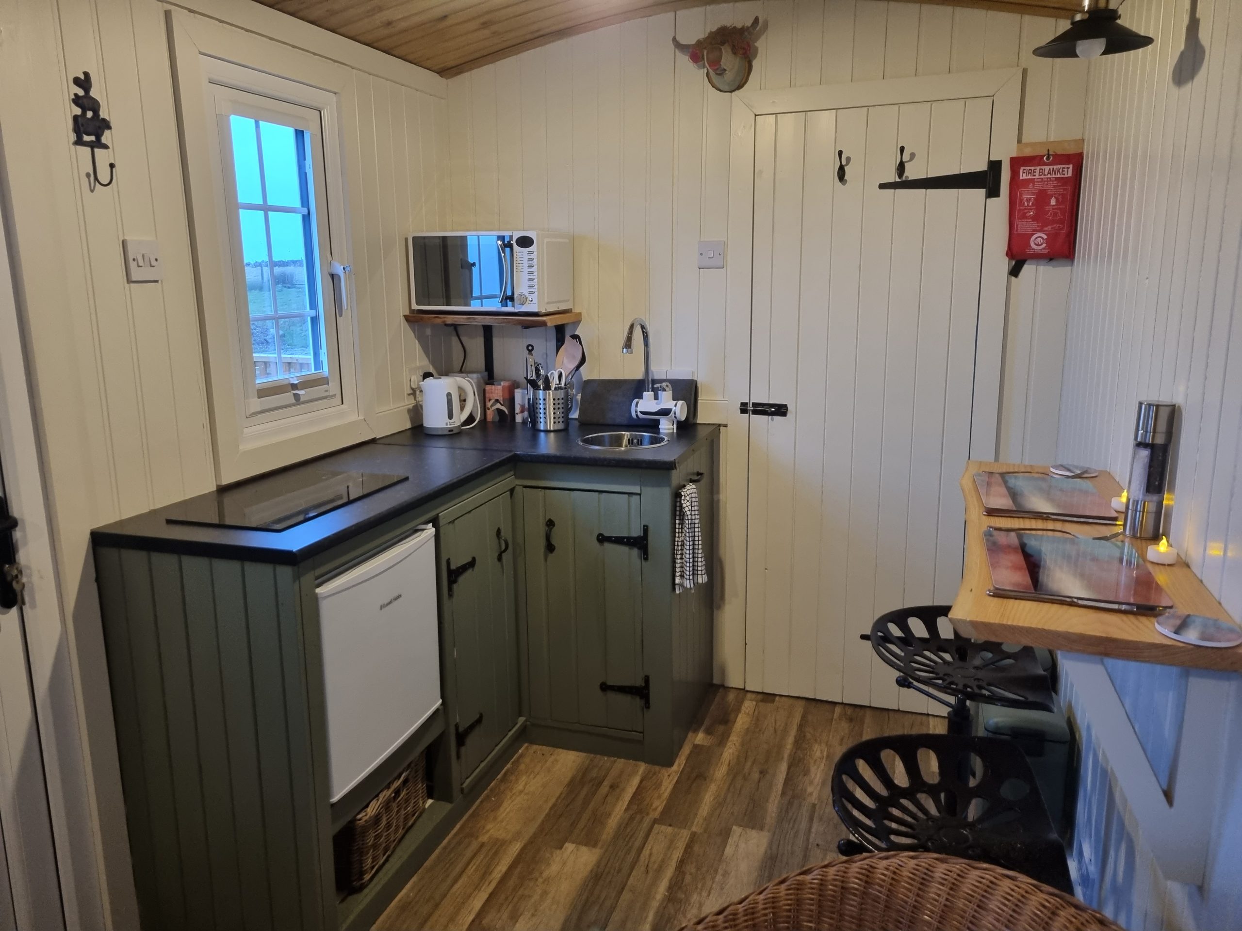Our cozy quirky hillside shepherds hut is well equipped for its petite size. With stunning views to Islay, Jura, Cara and Gigha from your built in double bed, decking or hot tub. The hut has a walk in shower room with WC, a small but well equipped Kitchenette with a breakfast bar. With Free view TV and free Wi-Fi you have the option to remain connected to the outside world if you want! The Kitchen includes a Microwave, George Foreman Grill, Slow Cooker, 2 ring hob, Kettle, toaster, undercounter fridge with micro freezer. There is a beautiful Everhot stove, which keeps you cozy and also has a small oven.